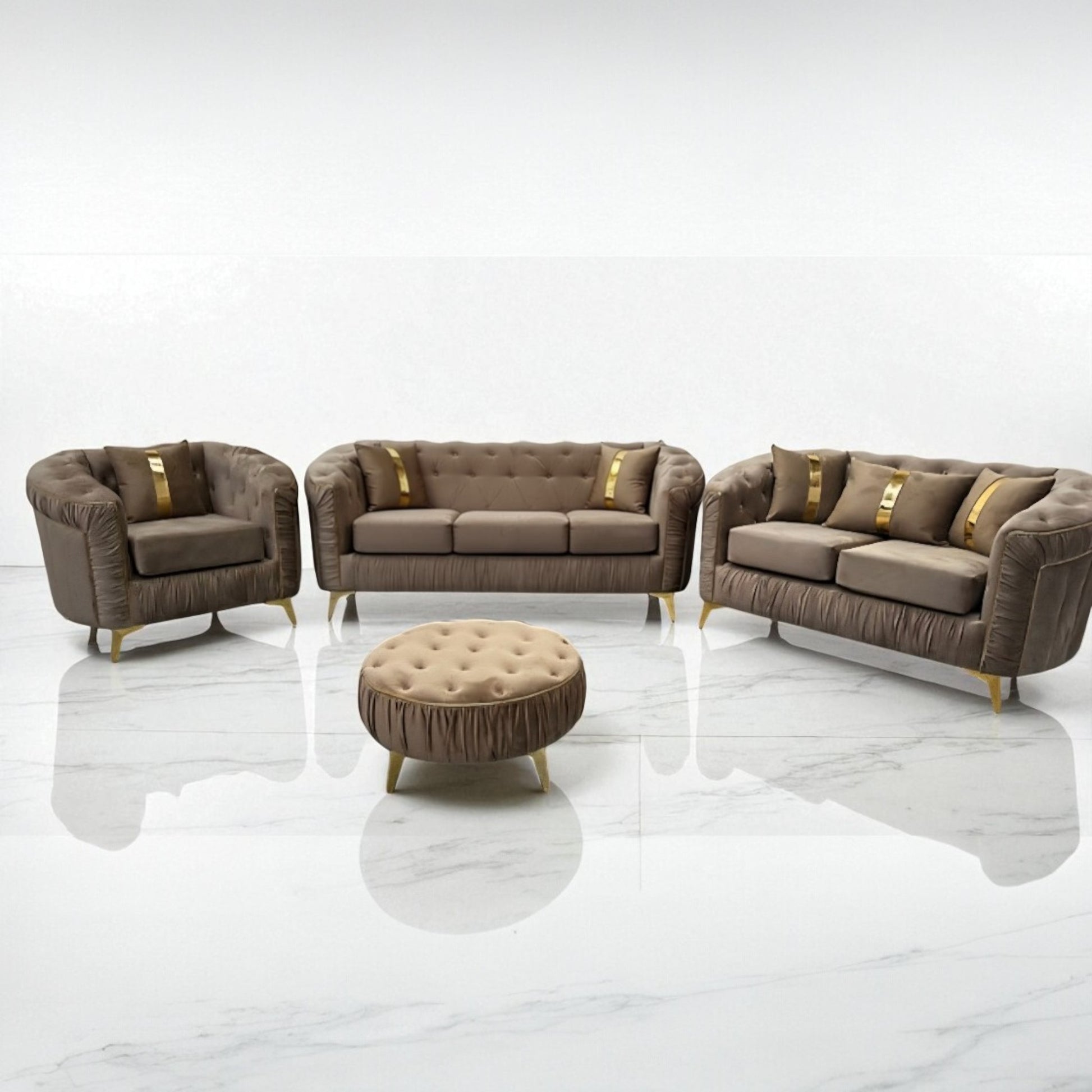 The Ambassador Chesterfield Sofa is a luxurious and stylish piece of furniture made with a mink velvet body and seats, and upholstered in plush velvet fabric. It is finished with either gold or chrome star legs, and comes with a choice of plain matching buttons or diamonte buttons. The sofa is made with reflex foam seats for excellent support and comfort. The sofa is available in three sizes: