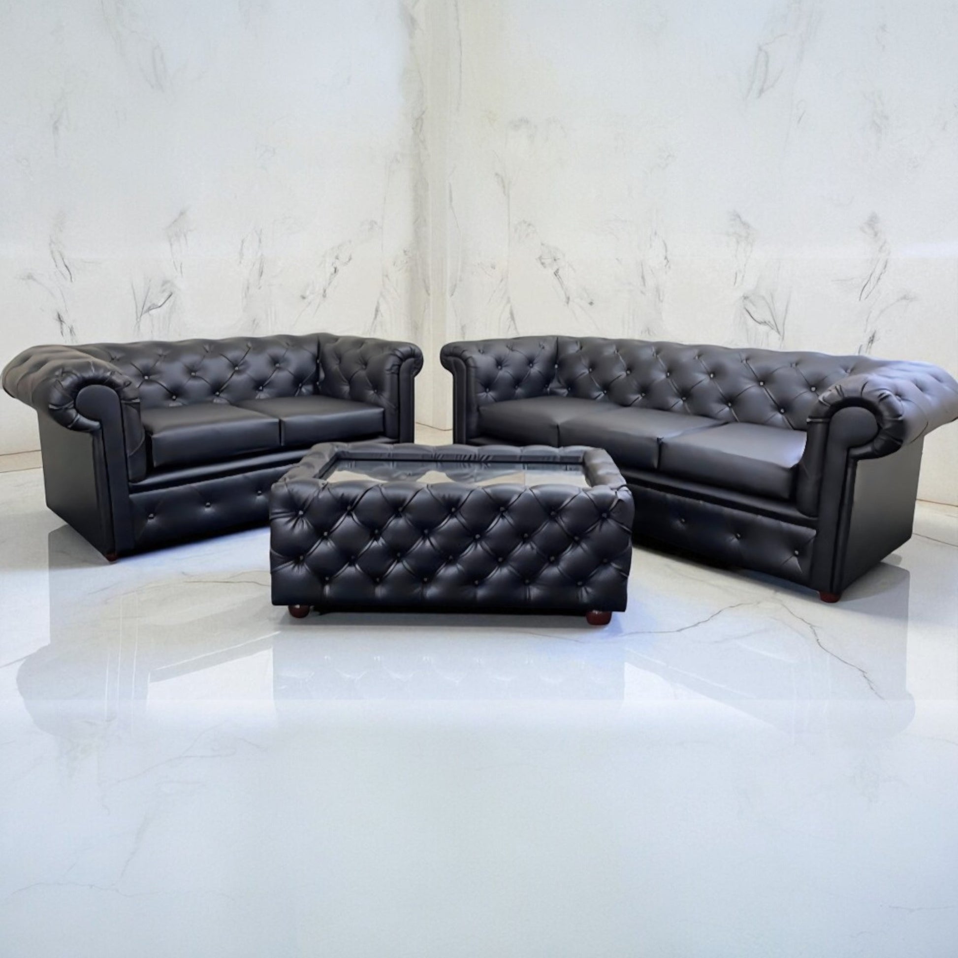 The Chesterfield Sofa in Black Bonded Leather is a new arrival and a stylish addition to any home. This sofa is made with a black bonded leather body and foam seats, and it is adorned with plain buttons embedded in the leather. Bonded leather is a type of leather that is made by bonding layers of leather together with a synthetic resin, and it is known for its durability and affordability. The sofa sits atop the original Chesterfield legs and is available in three sizes (all measurements are approximate):
