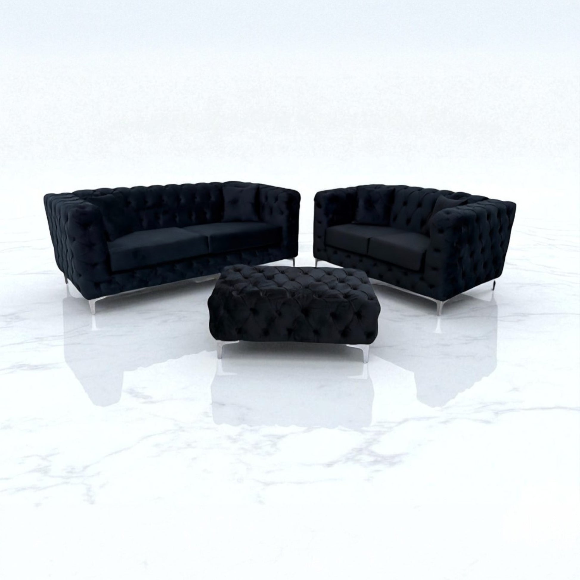 The Rocky Chesterfield Sofa is a luxurious and stylish piece of furniture made with a Black velvet body and seats, and upholstered in plush velvet fabric. It is finished with either gold or chrome high legs, and comes with a choice of plain matching buttons or diamonte buttons. The sofa is made with reflex foam seats for excellent support and comfort. The sofa is available in three sizes: