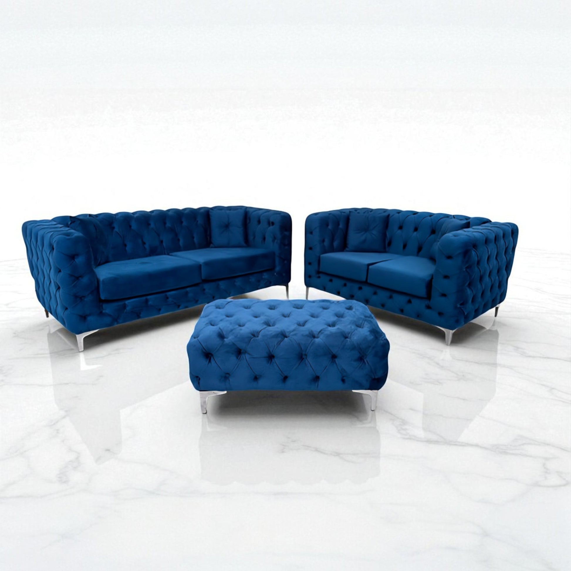 The Rocky Chesterfield Sofa is a luxurious and stylish piece of furniture made with a Blue velvet body and seats, and upholstered in plush velvet fabric. It is finished with either gold or chrome high legs, and comes with a choice of plain matching buttons or diamonte buttons. The sofa is made with reflex foam seats for excellent support and comfort. The sofa is available in three sizes: