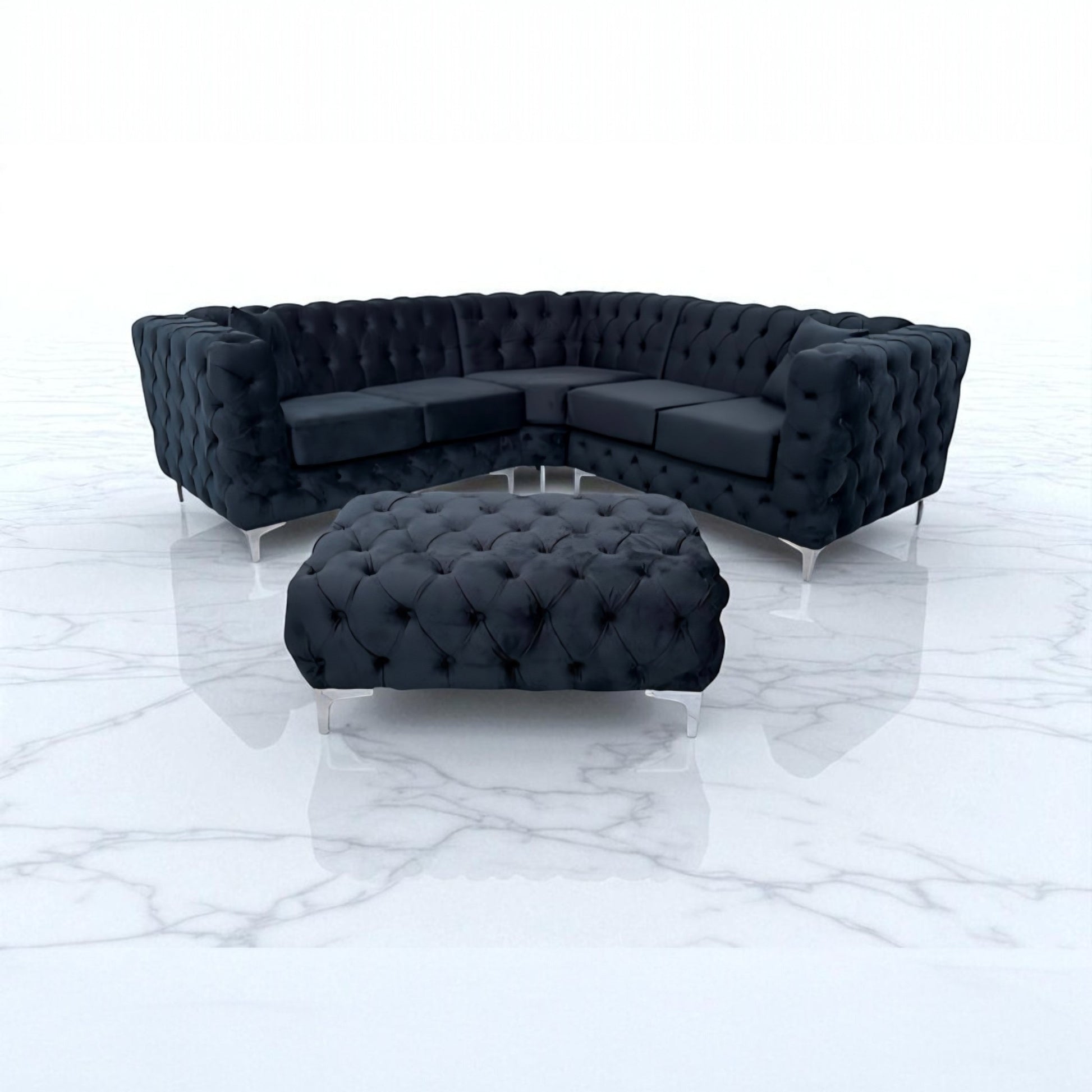 The Rocky Chesterfield Corner Sofa is a luxurious and stylish piece of furniture made with a black velvet body and seats, and upholstered in plush velvet fabric. It is finished with either gold or chrome high legs, and comes with a choice of plain matching buttons or diamonte buttons. The sofa is made with reflex foam seats for excellent support and comfort. The sofa is available in four sizes: