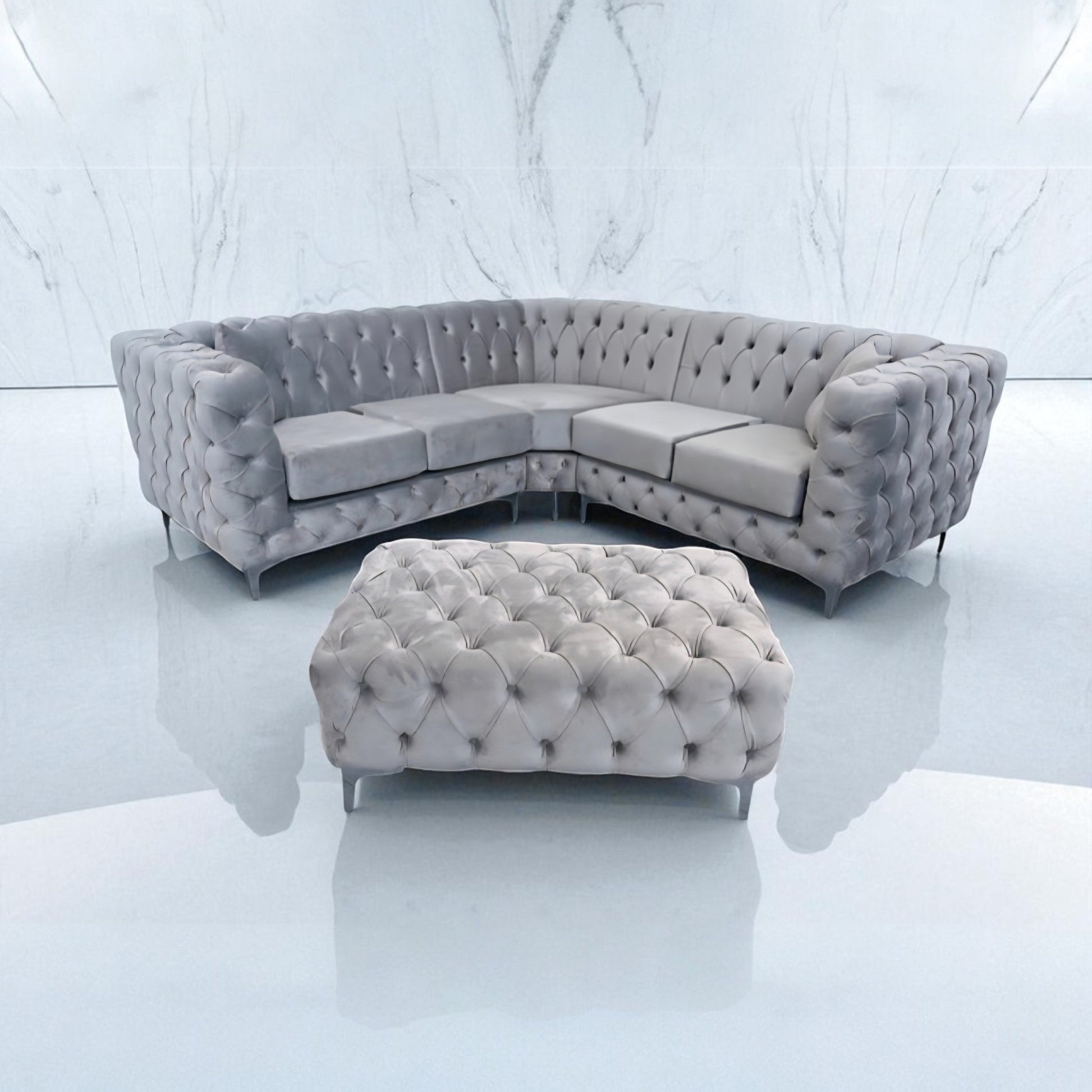 The Rocky Chesterfield Corner Sofa is a luxurious and stylish piece of furniture made with a silver velvet body and seats, and upholstered in plush velvet fabric. It is finished with either gold or chrome high legs, and comes with a choice of plain matching buttons or diamonte buttons. The sofa is made with reflex foam seats for excellent support and comfort. The sofa is available in four sizes:
